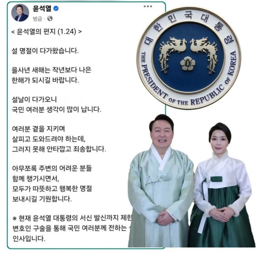 현재 윤석열 대통령의 서신 발신까지 제한된 상태여서, 변호인 구술을 통해 국민 여러분께 전하는 설날 인사입니다.