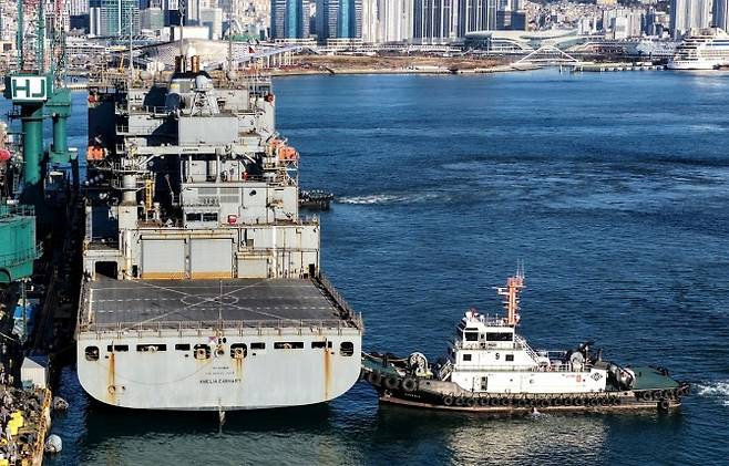 미 해군 해상수송사령부 소속 4만 톤급 군수지원함 ‘USNS 아멜리아 에어하트’가 12일 부산 영도 HJ중공업 조선소에 입항했다. 이 함정은 길이 210m, 너비 32m 규모로, 미 해군 전투함 등 주력 함정에 최대 6천 톤의 탄약, 식량, 건화물과 2천4백 톤의 연료를 보급할 수 있다.